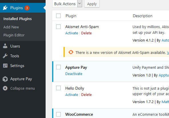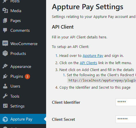 - Click on the Appture Pay menu tab in the WordPress Admin Menu